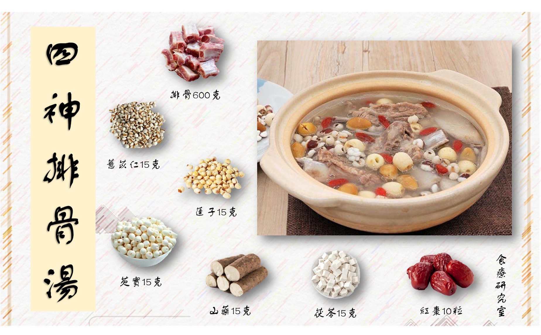 排骨600克、蓮子15克、薏苡仁15克、芡實15克、山藥15克、茯苓15克、紅棗10粒、生薑4片、米酒2湯匙、鹽少許